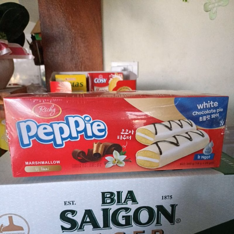 - Bánh bông lan nhân marshmallow phủ socola trắng Peppie: Đây là một trong những loại bánh được yêu thích nhất, với sự kết hợp hoàn hảo giữa vị ngọt của marshmallow và hương thơm của socola trắng.