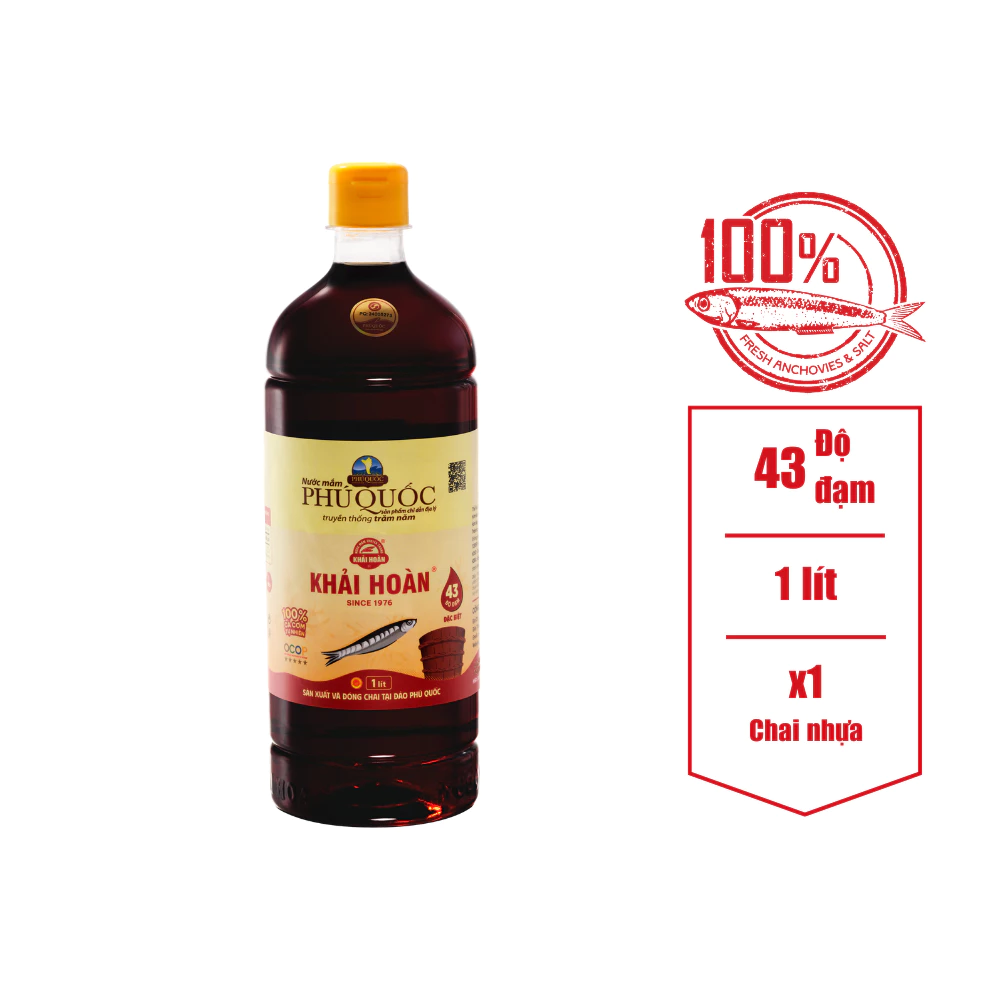 Nếu bạn đang tìm kiếm một sản phẩm nước mắm Phú Quốc chính hãng, hãy cân nhắc Nước mắm Phú Quốc Khải Hoàn chai 1 lít 43 đạm. Sản phẩm này được sản xuất từ cá cơm tươi và muối biển, với quy trình sản xuất nghiêm ngặt và truyền thống.