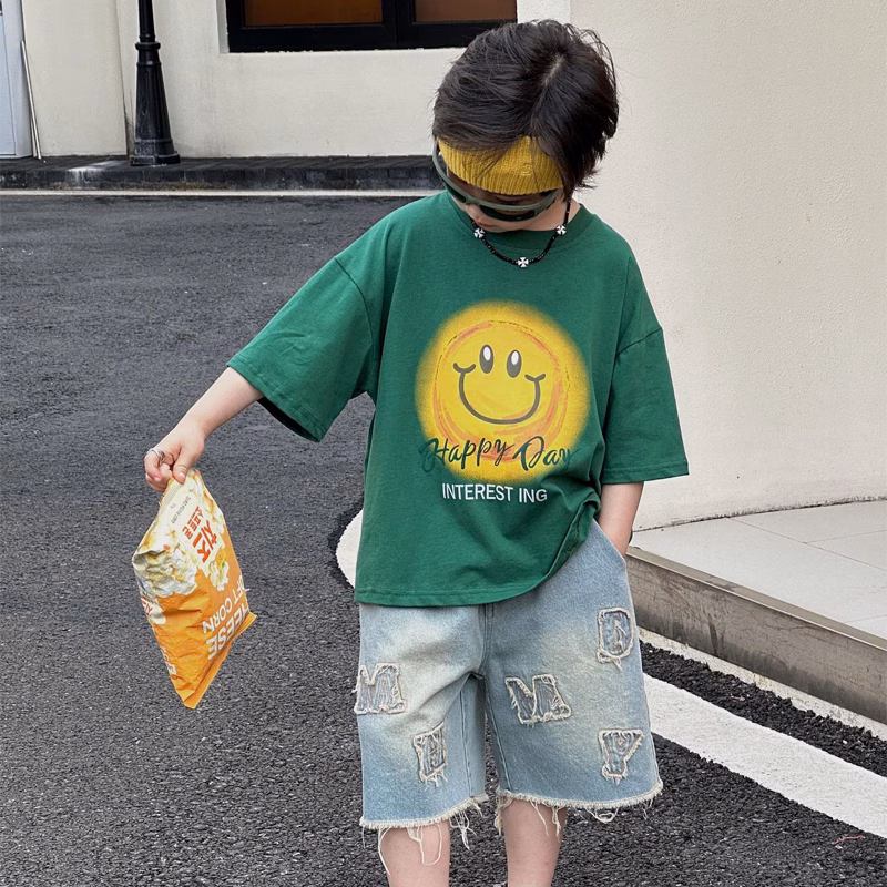 🔥 Đồ bộ bé trai áo cotton hình in chìm mặt cười nổi bật quần short jean mềm cá tính SB25_17 đang giảm giá!